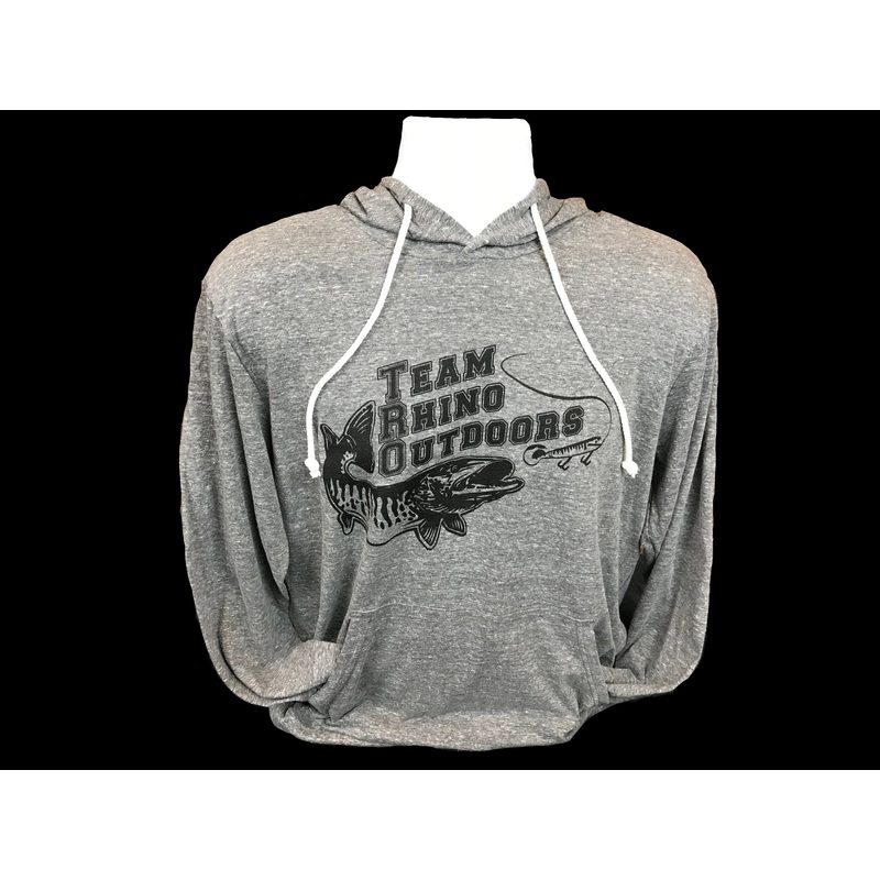 This is our new Tri Blend Hooded T Shirt. This item is heather grey with a black screen printed TRO logo. It's 4.7 oz and 50% polyester, 37% cotton, and 13% rayon. The Tri Blend Hooded T has a classic fit and is lightweight.